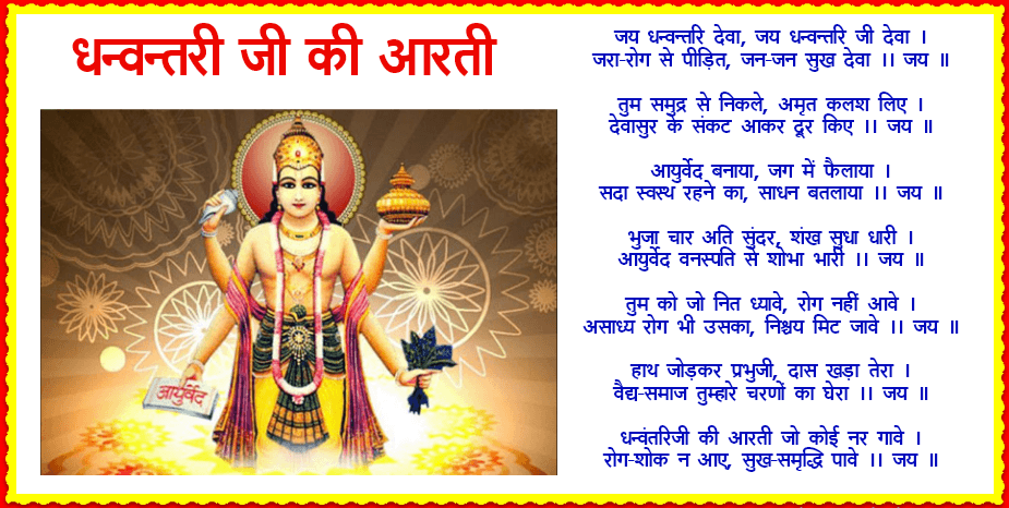 आयुर्वेद के अनुसार भी धर्म, अर्थ, काम और मोक्ष की प्राप्ति स्वस्थ शरीर और दीर्घायु से ही संभव है। शास्त्र भी कहते हैं कि ‘शरीर माध्यम खलु धर्म साधनम्’ अर्थात- धर्म का साधन भी निरोगी शरीर ही है, तभी आरोग्य रुपी धन के लिए ही भगवान् धन्वन्तरि की पूजा आराधना की जाती है। ऐसा माना जाता है की इस दिन की आराधना प्राणियों को वर्षपर्यंत निरोगी रखती है। समुंद मंथन की अवधि के मध्य शरद पूर्णिमा को चंद्रमा, कार्तिक द्वादशी को कामधेनु गाय, त्रयोदशी को धन्वंतरी और अमावस्या को महालक्ष्मी का प्रादुर्भाव हुआ। धन्वंतरी ने ही जनकल्याण के लिए अमृतमय औषधियों की खोज की थी। इन्हीं के वंश में शल्य चिकित्सा के जनक दिवोदास हुए महर्षि विश्वामित्र के पुत्र सुश्रुत उनके शिष्य हुए जिन्होंने आयुर्वेद का महानतम ग्रन्थ सुश्रुत संहिता की रचना की।